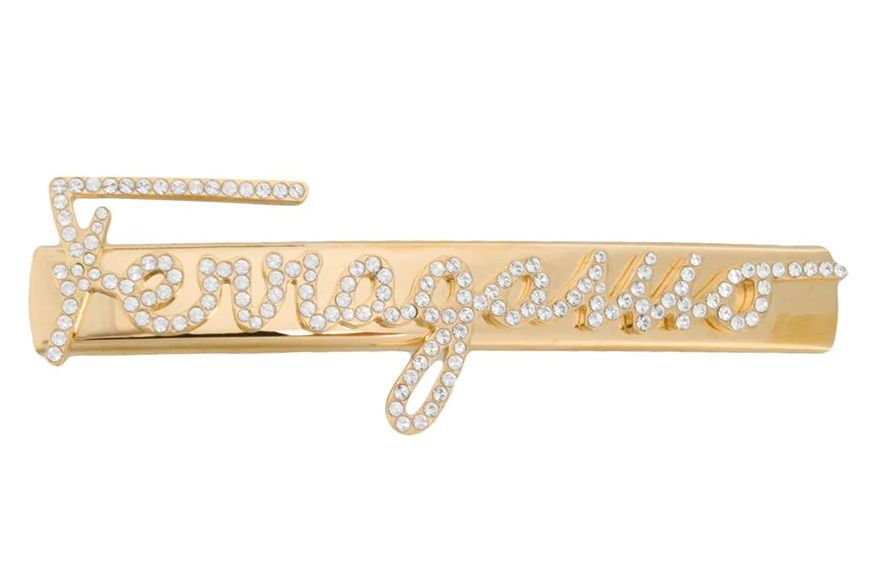 這個發(fā)夾閃亮的金色飾面上,飾有以施華洛世奇水晶鑲嵌而成的手寫版Ferragamo標志,風格華麗,十分閃耀。