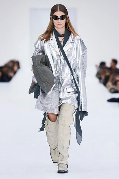 其他值得留意的中央包括帶有祖母花卉的簇絨襯里、或有絎縫的奢華毯子連衣裙、鑲嵌有水晶的羅紋襪靴、陳舊的褪色針織單品、分層流蘇式連衣裙、以及重復回歸的后 Talking Heads 時期方形西裝外套。這些外套采用復染皮革制成,這也是 Acne Studios 的另一個早期標志。此外,本著循環再造的肉體,此次秀場上座椅所用的人造毛皮將重新用于行將推出的服裝系列,其他局部將捐給巴黎時裝學校 Studio Berçot。